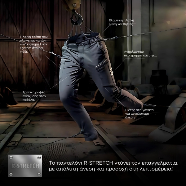 Το παντελόνι R-Stretch από ελαστικό βαμβακερό ύφασμα twill (διαγώνια πλέξη), ντύνει τον επαγγελματία με απόλυτη άνεση και προσοχή στη λεπτομέρεια.